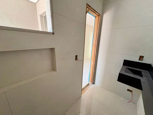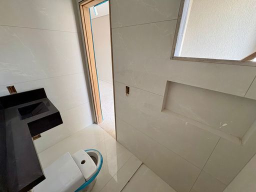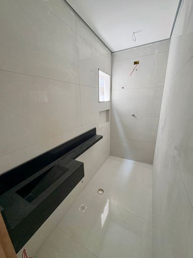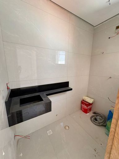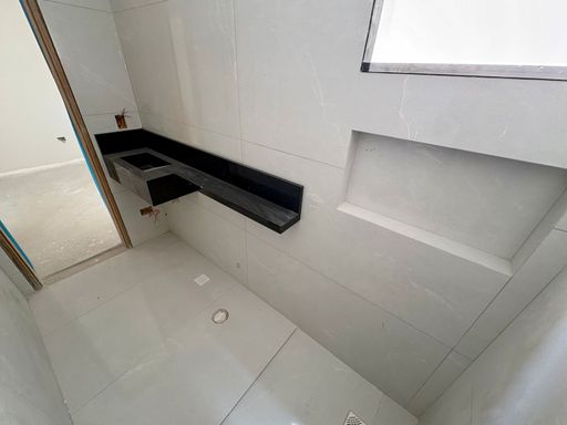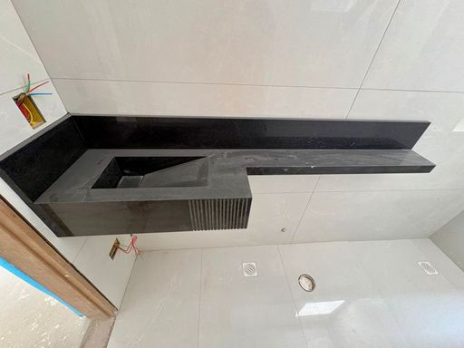- Banheiros com pia de granito preto esculpido e com nichos de porcelanato esculpido